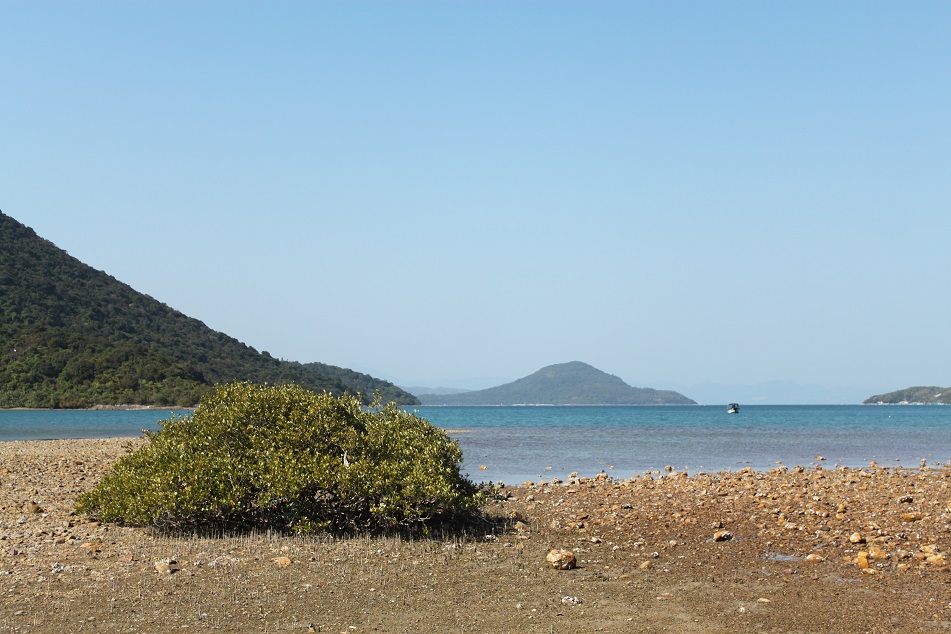Before arriving at the village of Chek Keng, a small cove with clear blue water, dotted with small verdant islands between headlands, steals our attention. We walk down the exposed rocky bed, finding lonesome young mangroves seemingly out of place among the otherwise barren land. “The last time I went home from Tai Long Wan through this path was almost sunset, so we had to rush and I was completely unaware of this,” James recalls. “It’s so beautiful.”