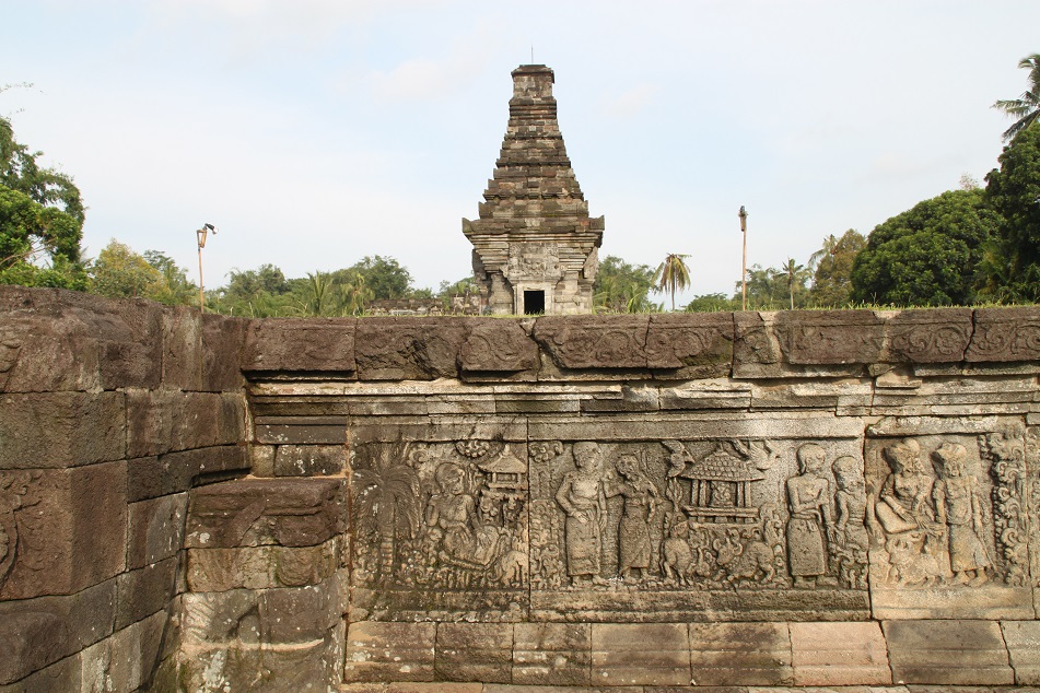In front of Candi Candra Sengkala is Batur Pendapa, where it is believed that devotees once placed offerings in religious ceremonies. Modern-day visitors would likely notice the strange look of the main sanctum, Batur Pendapa, as well as Bale Agung – also located at the front part of the compound – for they all seem to have lost their upper structures. Believed to be made from perishable materials – possibly wood and ijuk (palm fiber) – these structures have long succumbed to the power of nature. Fortunately some relief panels at the lower part of the main temple suggest how the whole structure used to look, which unsurprisingly reminds me of some Hindu temples in Bali given the fact that many Javanese royals fled to the neighboring island following the decline of Hinduism in Java.