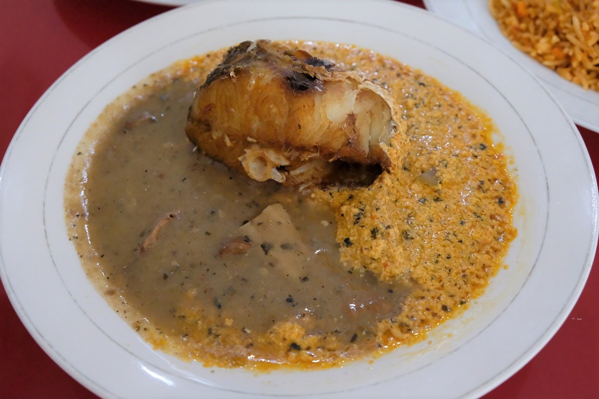 Prior to my visit, I’d watched quite a number of videos on YouTube about jollof rice, a dish that is popular in West Africa (and a source of national pride as each country has its own version of it) and had been curious to try ever since. When I finally tasted it myself at this low-key place, I was pleasantly surprised to find it even more delicious than what I expected. Its savory and umami flavor, with a little hint of sweetness and tartness, made it like comfort food that you just want to keep eating. We also tried nsala (a thick soup made from ground crayfish, yam, utazi leaves, pepper and other ingredients), egusi (a different soup made from ground melon seeds, red palm oil, meat and fish, and other ingredients that are foreign to me), and fufu (traditionally made from cassava, plantain or cocoyam, but the one we tried was made from wheat flour). There was something familiar yet foreign about the flavors of these Nigerian dishes, though they’re more peppery than most Indonesian food, but overall I quite enjoyed my first ever foray into the Nigerian/West African culinary tradition, ensuring a second trip or a repeat order in the future.