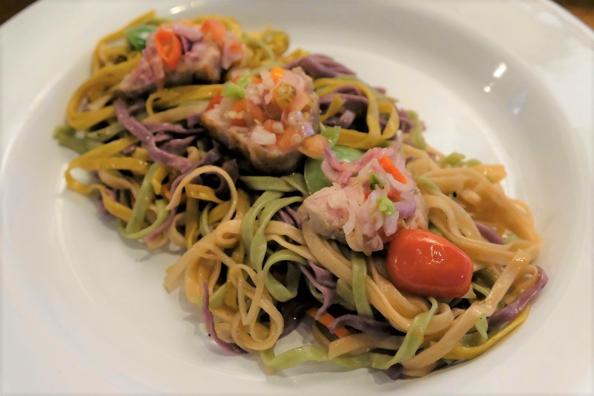 Sharing a space with the shop is their small restaurant serving Indonesian dishes made using Javara’s products. Here for the first time we tried West Sumatra’s ikan asam padeh, a sour and spicy soup with skipjack tuna. It intrigued me that this light and refreshing dish comes from the same region that produces rich and spice-laden delicacies like rendang and different types of curry-like dishes that can be found at eateries throughout Indonesia. We were also delighted by tumis jantung pisang (stir-fried banana blossom), tempe/tempeh nuggets (it was like eating usual chicken nuggets, but healthier), as well as mie pelangi tuna dabu-dabu (naturally-colored vegetable noodles with pan-seared tuna and chopped sambal/spicy condiment from North Sulawesi). If the name Javara sounds familiar to you that’s because I have written about its outlet in Semarang’s Kota Lama that serves different dishes from its Jakarta outlet but is still dedicated to Indonesian food.