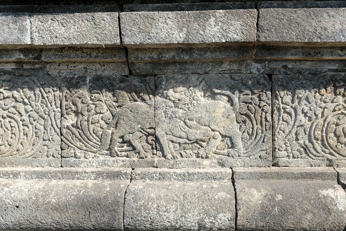 Another panel depicts two friends: a bull called Syatrabah and a lion. But because of a provocation by a wolf called Dimnah, the two become suspicious of one another and start a fight until they both die. This lesson teaches us to be careful of who we listen to and to never trust a warmonger. On another side of the temple, a relief panel shows a man called Bhimaparakrama who’s about to be attacked by a lion. But thanks to the sword and the shield he carries, the lion runs away. Maybe this tells us to always be prepared for the worst in life.